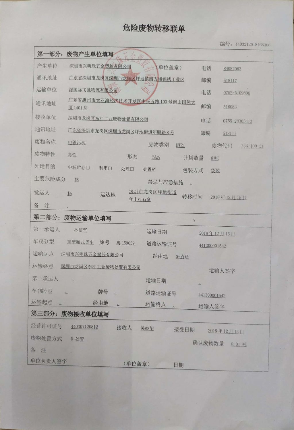 危险废物转移联单