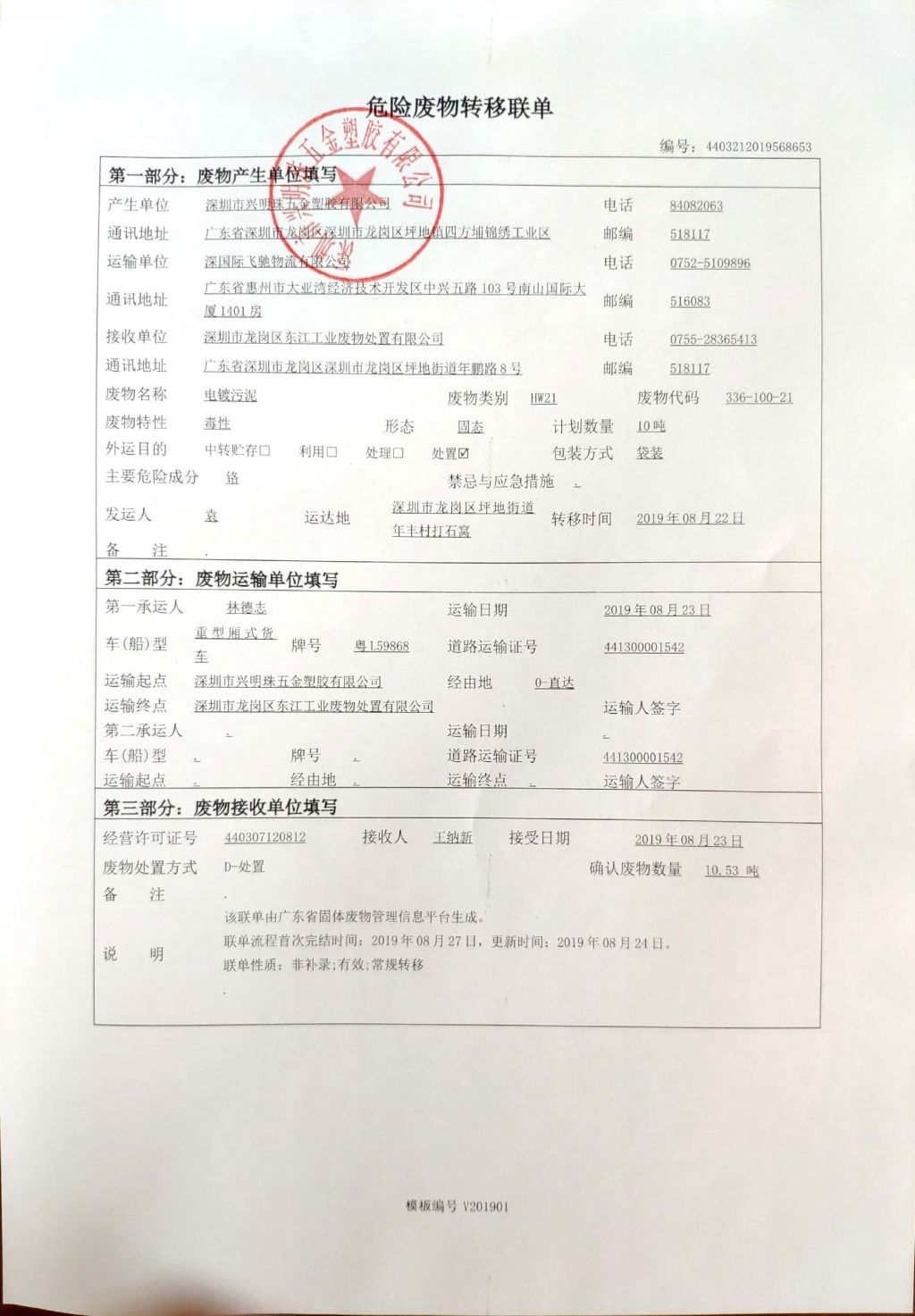 危险废物转移联单