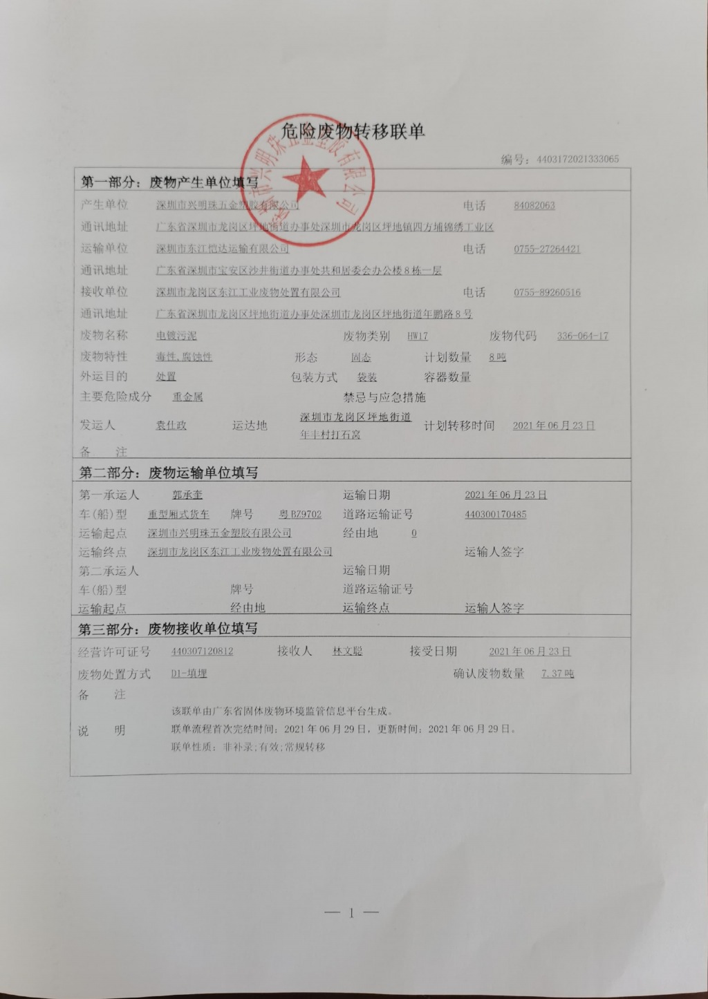 危险废物转移联单