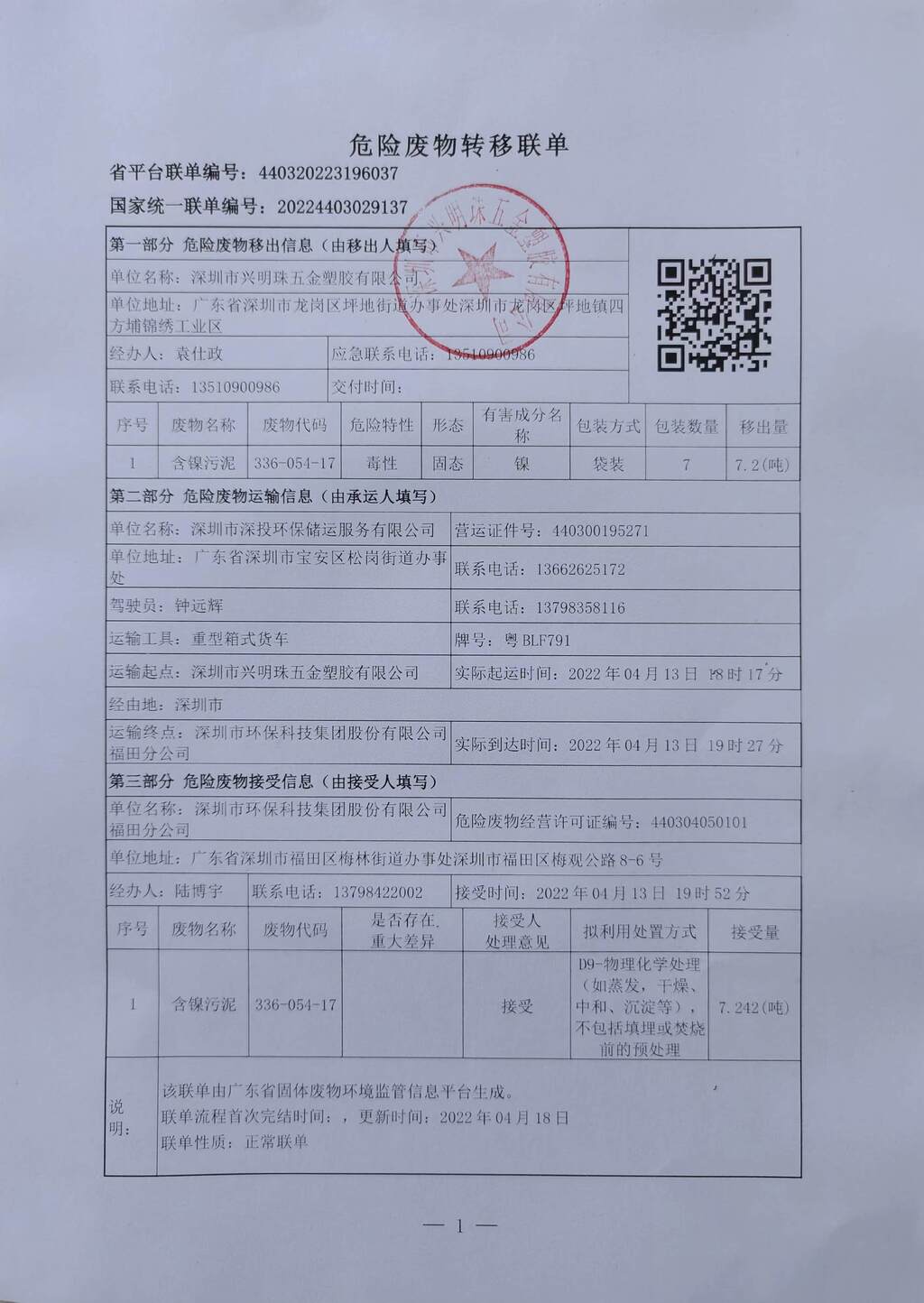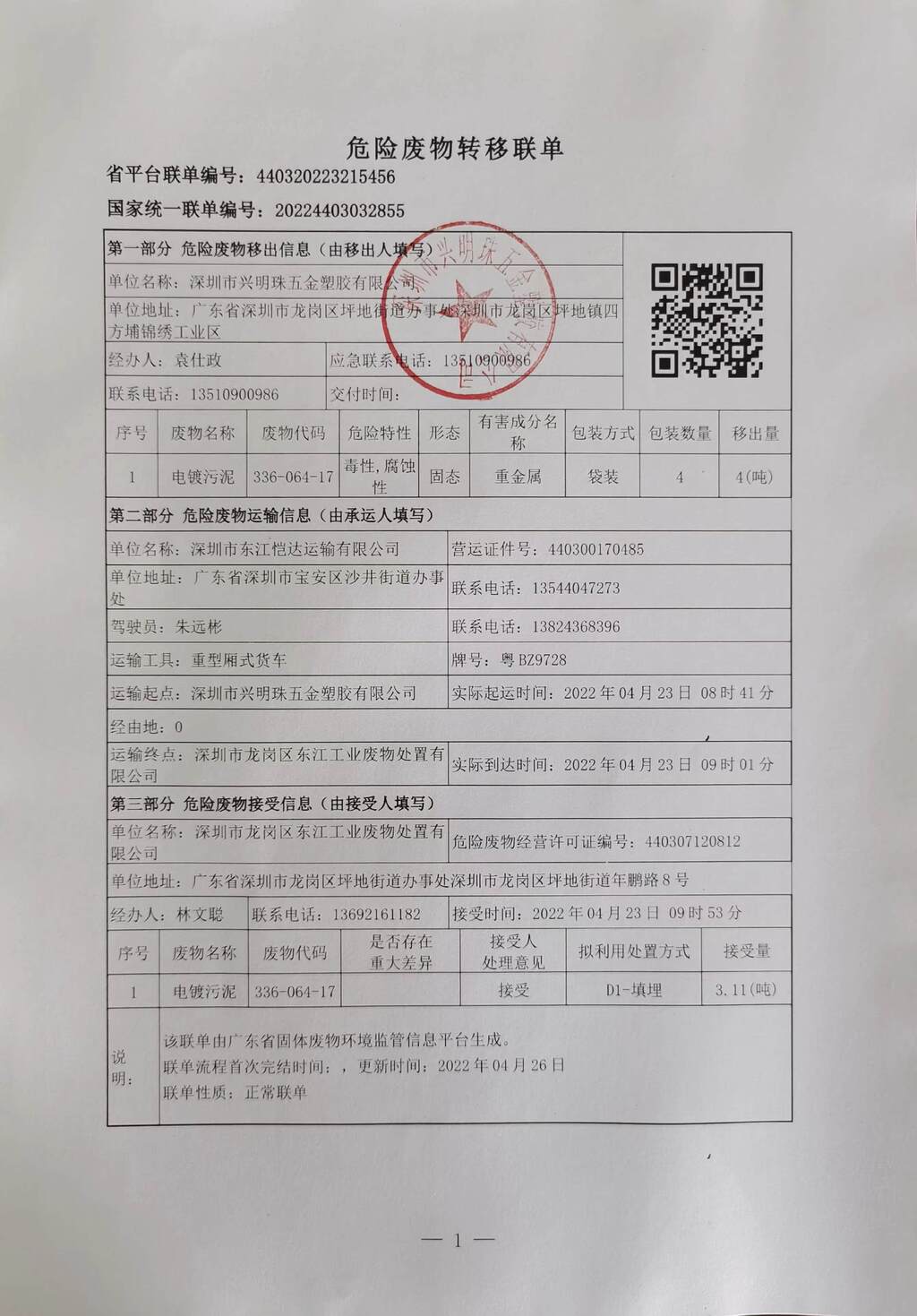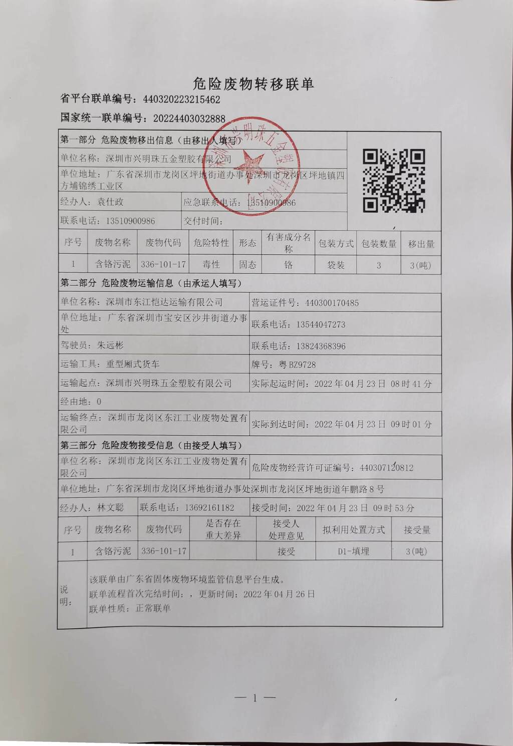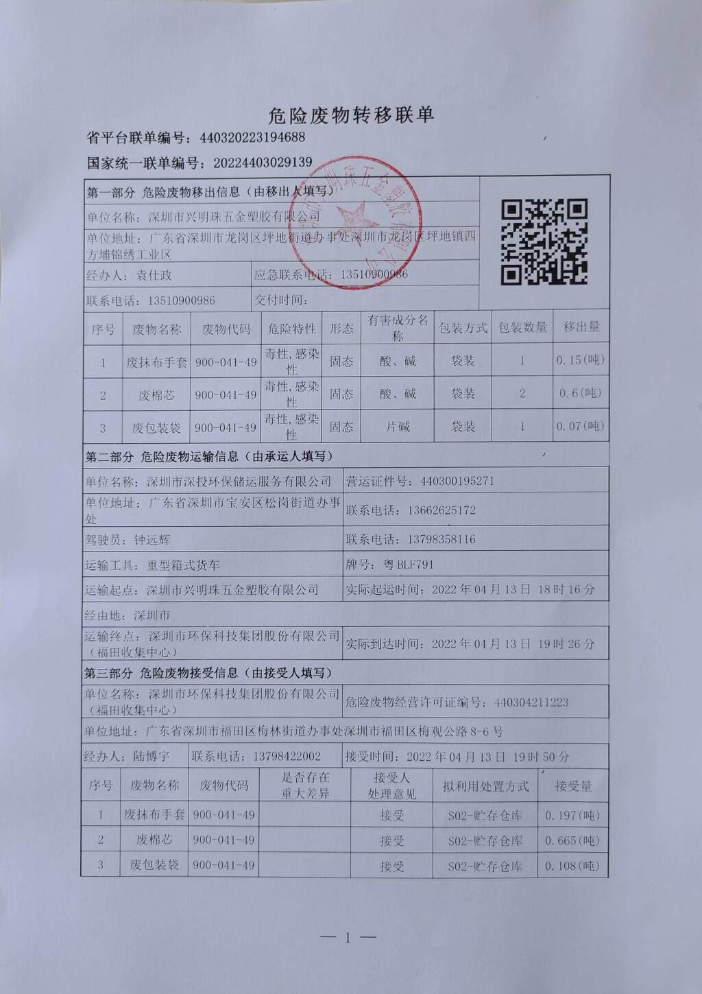 危险废物转移联单