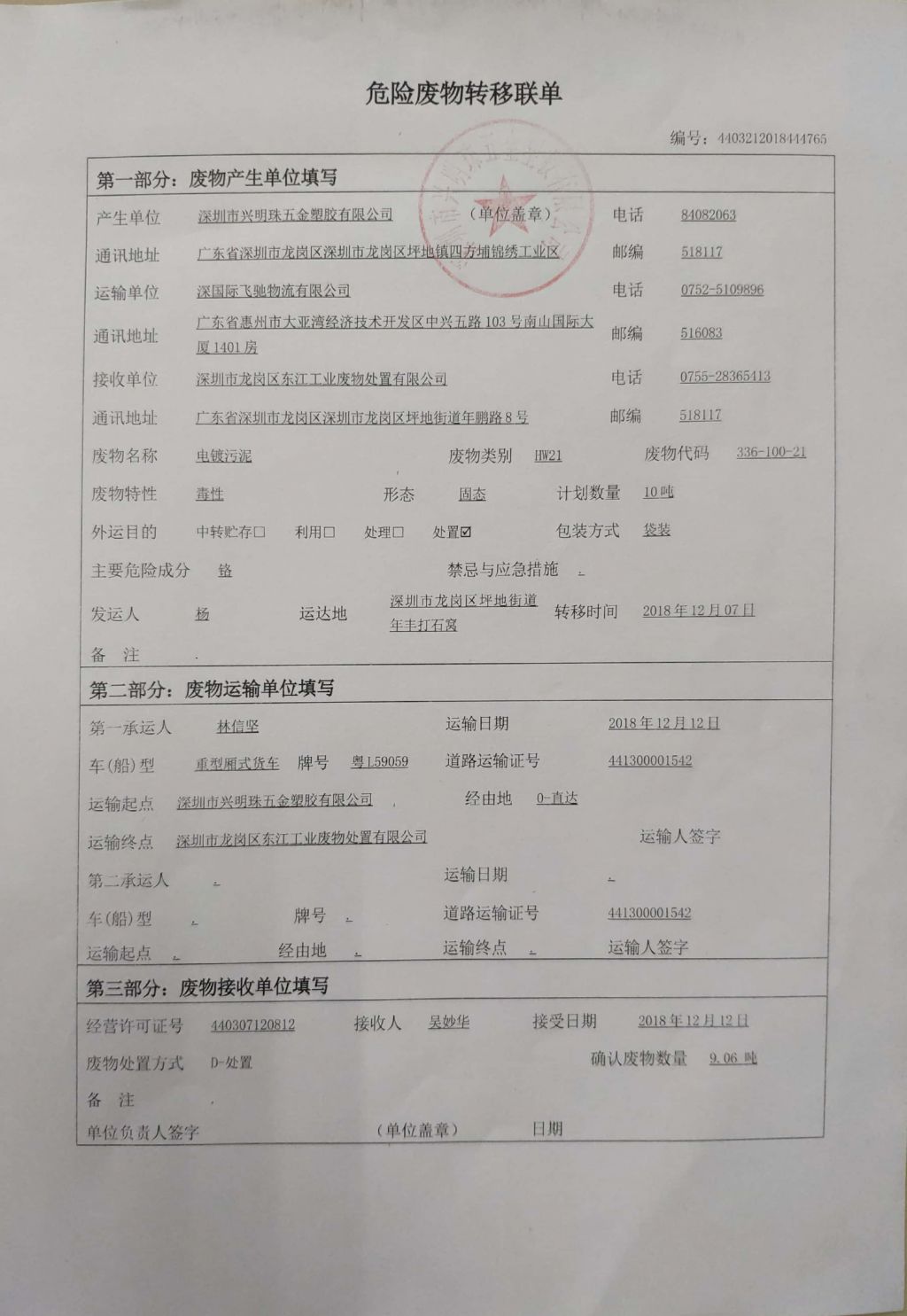 危险废物转移联单