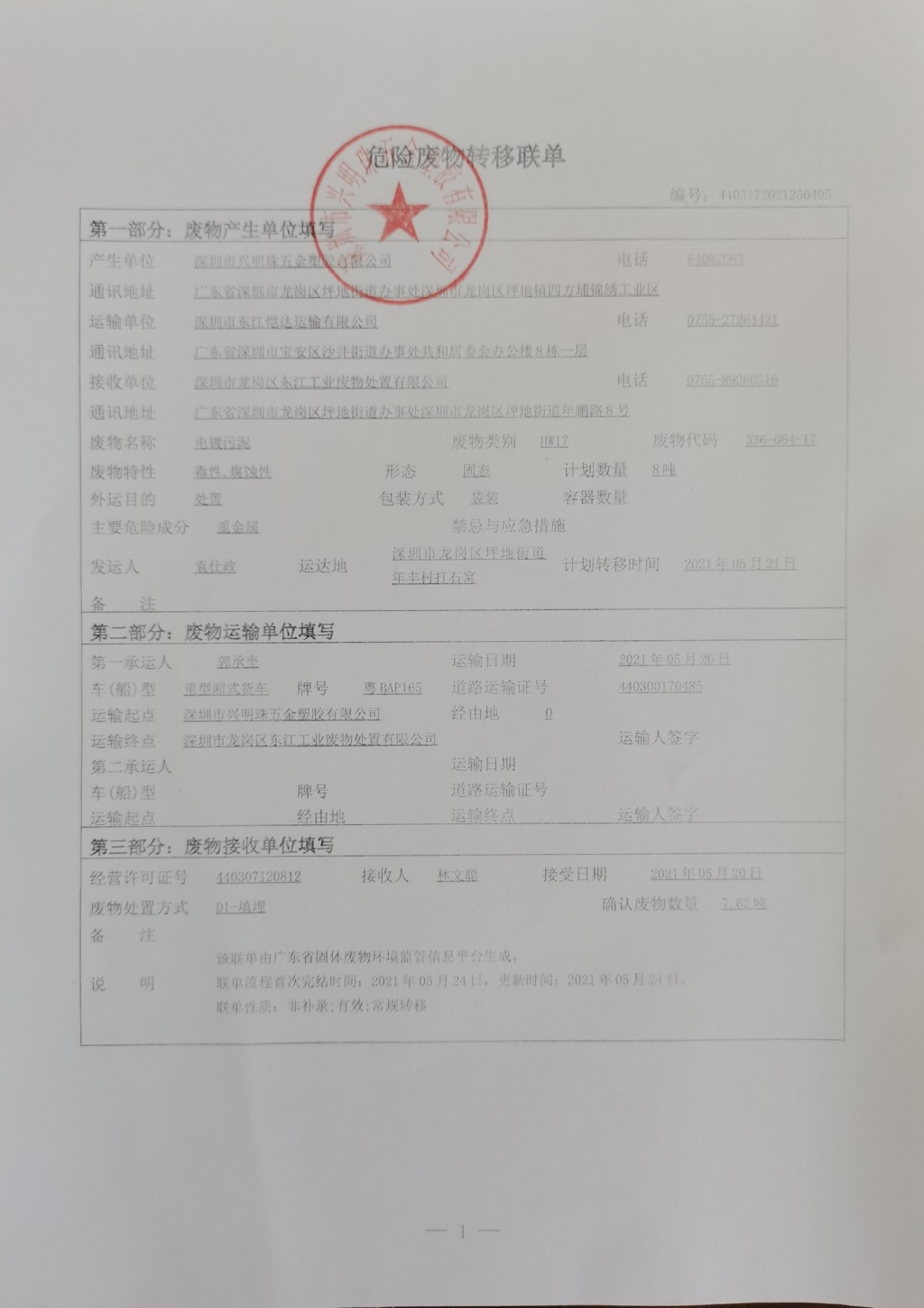 危险废物转移联单