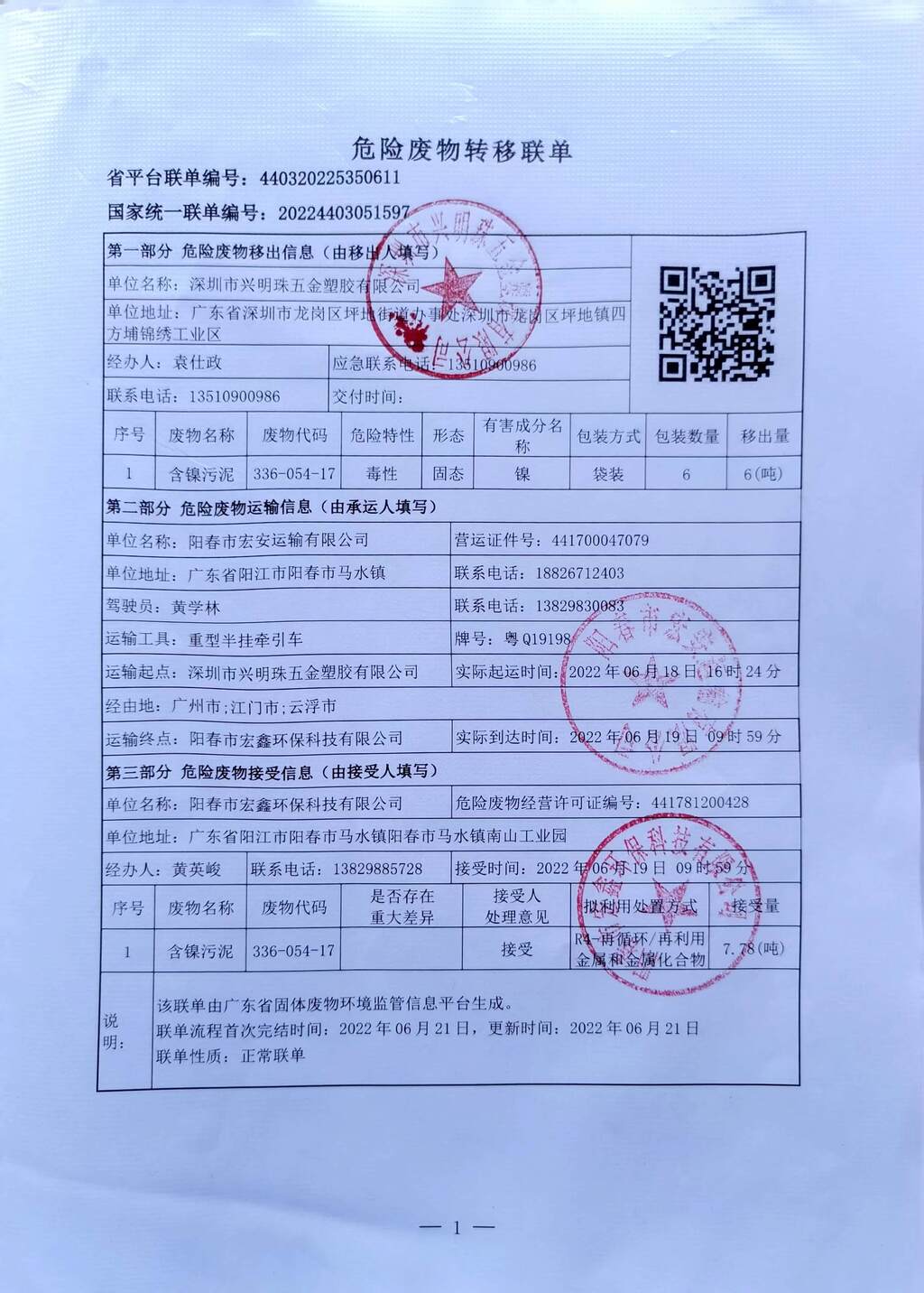 危险废物转移联单