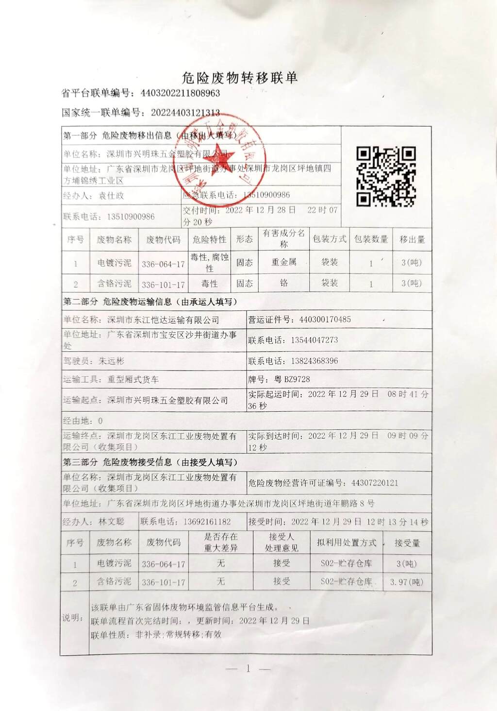 危险废物转移联单