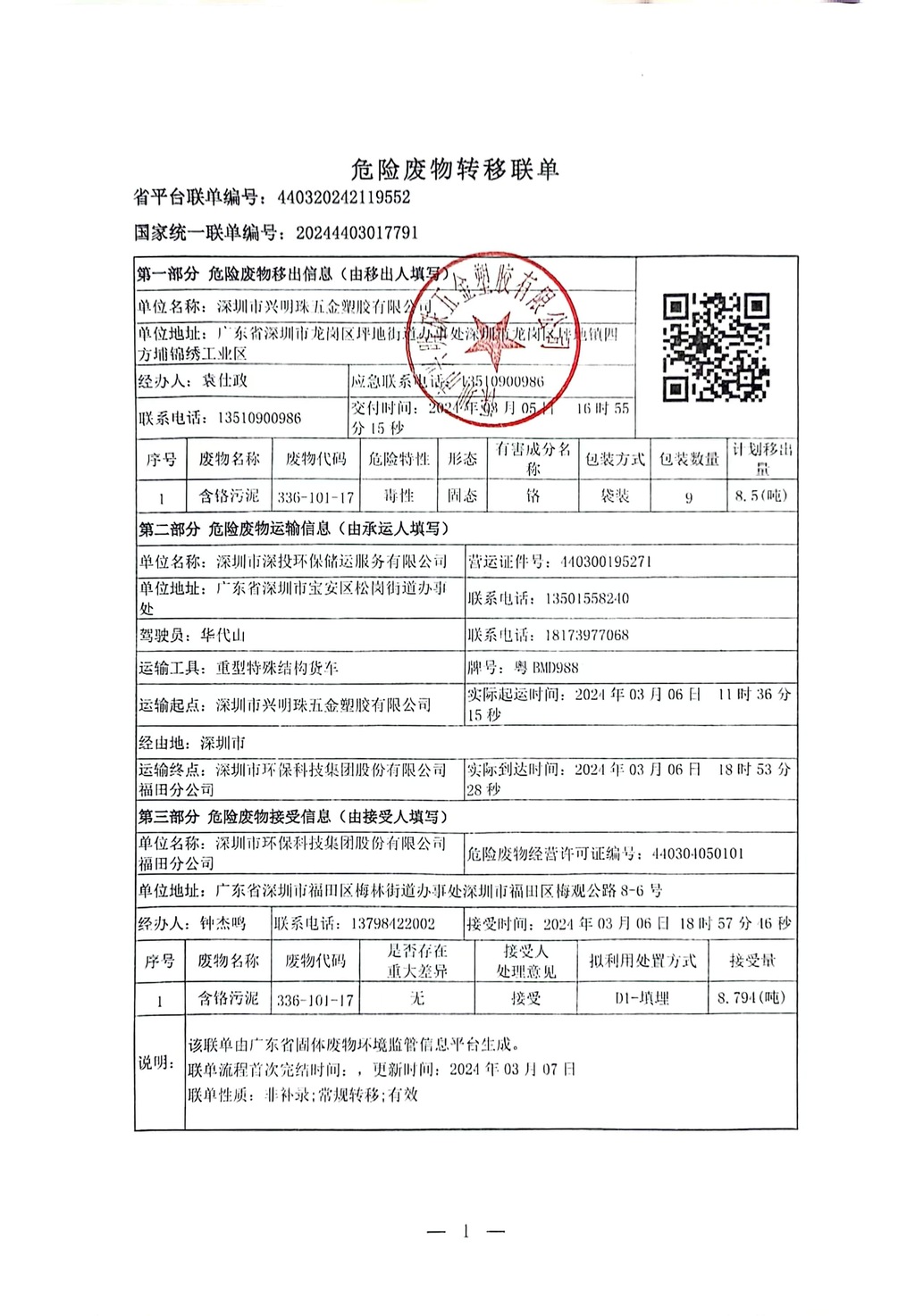 危险废物转移联单